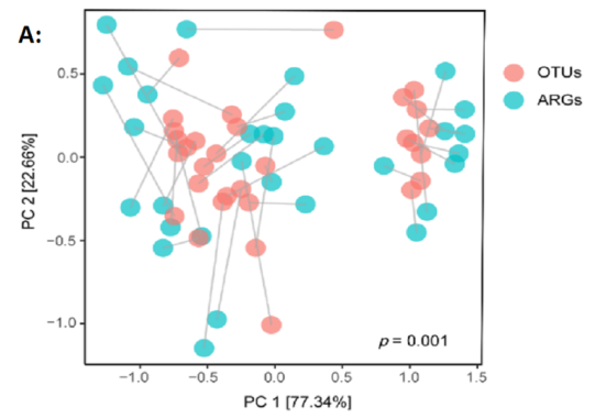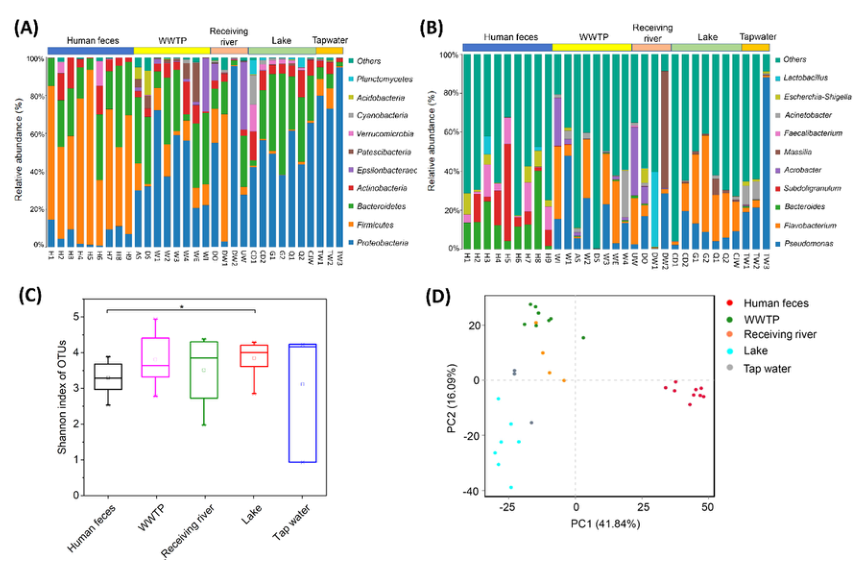細(xì)菌群落多樣性分析表明,除自來水外,其他水環(huán)境樣品的平均Shannon指數(shù)均高于人類糞便樣品(圖5C)。PCoA分析表明,人類糞便和環(huán)境樣本之間的細(xì)菌群落組成有顯著差異(圖5D)。然而,在人類糞便和水環(huán)境中存在著167個OTUS屬121個常見細(xì)菌屬,此外,還發(fā)現(xiàn)ARGs與所有樣品中的細(xì)菌群落顯著相關(guān)(圖3A),這表明細(xì)菌群落組成決定了ARG組成,這一現(xiàn)象在各種環(huán)境中都被廣泛觀察到。