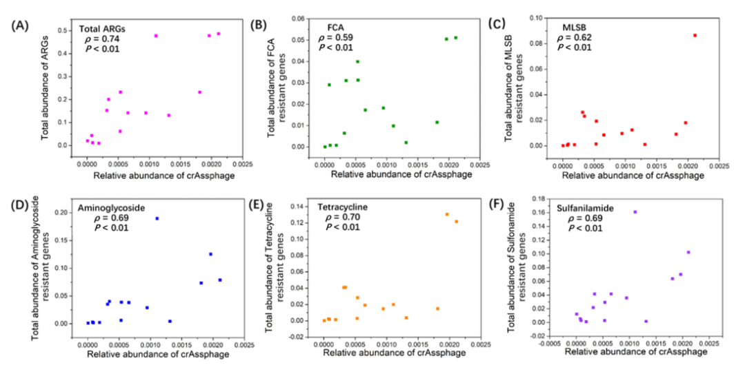 圖3.按目標(biāo)抗生素分類的ARGs總豐度與水樣中crAssphage豐度之間的相關(guān)性