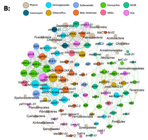 在該研究中,84個ARGs、5個MGES和20個細(xì)菌門被用來進(jìn)行網(wǎng)絡(luò)分析(圖6B)。Chlamydiae和Dependentiae 與11種不同的ARG顯著相關(guān),表明它們的基因組中可能含有多種ARG類型。四環(huán)素耐藥基因、大環(huán)內(nèi)酯類耐藥基因ermB和氨基糖苷類耐藥基因aacA/aphD是四環(huán)素耐藥基因的潛在宿主。Elusimmicrobia可能是aadE、blaCTX-M-02、Olec和vanRA-01的宿主。Synergistetes 可能是tetW、IS613和catA1的潛在宿主。由于該網(wǎng)絡(luò)是建立在相關(guān)性的基礎(chǔ)上,觀察到的ARGs潛在細(xì)菌宿主仍需進(jìn)一步的試驗驗證。