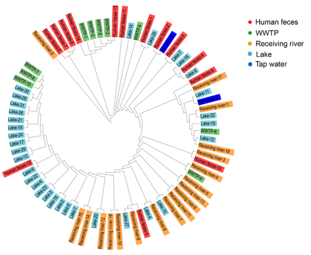 除了crAssphage 之外,研究者通過構(gòu)建系統(tǒng)發(fā)育樹分析了來自所有樣品的氨芐青霉素抗性菌株中的 blaTEM-1基因序列(圖4)。結(jié)果表明,來自四種環(huán)境樣品(湖水、自來水、污水處理廠和受納河水)的blaTEM-1與腸道樣品的進(jìn)化關(guān)系密切(圖4)。該結(jié)果表明blaTEM-1可能通過污水排放在人類糞便和受納水體之間進(jìn)行傳播。然而,需要進(jìn)一步的研究來驗證這些發(fā)現(xiàn)。