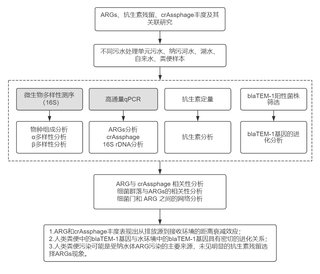 環(huán)境中細(xì)菌的抗生素耐藥性由于與臨床病原體的抗生素耐藥性密切相關(guān)而受到越來越多的關(guān)注。自從人類在臨床上使用抗生素以來,環(huán)境中的抗生素耐藥基因(ARGs)亦有所增加。然而,這種增加是否直接來源于環(huán)境殘留抗生素的選擇性壓力還是來源于人類大量排放的糞便污染卻不得而知。在該項研究中,調(diào)查了人類糞便以及受人類糞便污染影響的不同污水處理廠受納水環(huán)境中的 ARGs、crAssphage 和抗生素殘留特征,以期了解抗生素的選擇壓力和人類糞便污染對受納水體ARGs污染的影響。