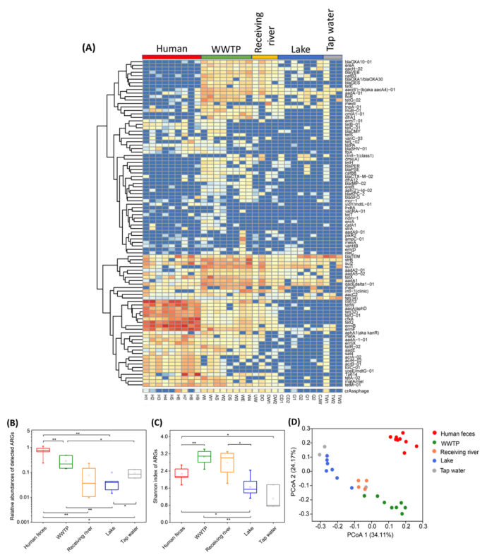 ARG多樣性也隨著水從污水處理廠向自來水的輸送而減少(1C)。所有樣本的ARG譜的PCoA表明,不同類型的樣本包含顯著不同的ARG成分。從環(huán)境樣品中分離出人類糞便中的ARGs(圖1D),表明腸道具有獨(dú)特的ARG圖譜。這可能是因為與環(huán)境相比,腸道的條件不同。來自污水處理廠和受納河水的樣品聚在一起較近,證實了污水處理廠出水的排放對受納河中的ARGs有很大影響。同樣,湖泊和自來水更傾向于聚集在一起,與所研究的湖泊都是自來水水源一致。上述結(jié)果表明,在所研究的樣品中普遍存在ARGs,污水處理廠攜帶的ARGs可能污染不同的受納水體。