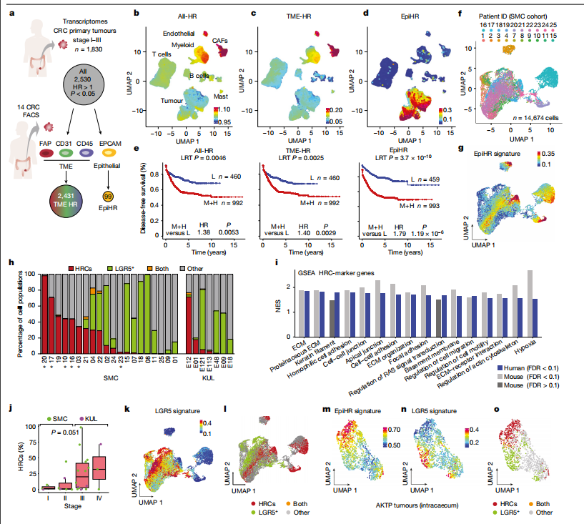 該團隊通過單細胞轉(zhuǎn)錄組測序(scRNA-seq)手段,首先對CRC患者樣本進行數(shù)據(jù)分析,發(fā)現(xiàn)大多數(shù)不良預(yù)后基因是由一群獨特的腫瘤細胞(包括:CAFs、內(nèi)皮細胞以及較小程度上髓系細胞)表達的,該團隊將其命名為高復(fù)發(fā)細胞(high-relapsecells,HRCs)。