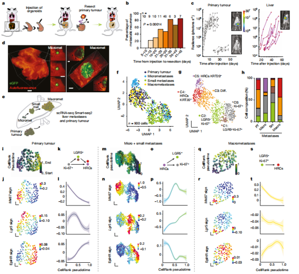 接著研究團隊建立了CRC小鼠模型,模擬手術(shù)切除原發(fā)腫瘤后發(fā)生轉(zhuǎn)移性復(fù)發(fā)的過程。發(fā)現(xiàn)原發(fā)性CRC手術(shù)后,小鼠肝臟中殘留的HRCs的增殖活動很少,對原發(fā)性結(jié)腸癌的生長沒有貢獻。但隨著時間的推移,殘留的HRCs會產(chǎn)生多種細胞類型,包括LGR5干細胞樣腫瘤細胞。這群HRC細胞能夠脫離原發(fā)性結(jié)腸癌,遷移到血液中,到達肝臟,并在手術(shù)后隱藏一段時間,隨后引發(fā)明顯的腫瘤轉(zhuǎn)移。