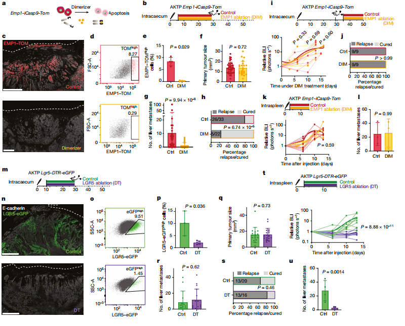 為了找到結(jié)直腸癌的轉(zhuǎn)移性復(fù)發(fā)的真正來源,研究人員借助人和小鼠模型,借助單細胞轉(zhuǎn)錄組測序技術(shù)(scRNA-seq),發(fā)現(xiàn)EMP1在 HRCs細胞中高表達,且與EpiHR基因的表達有很大的重疊。進一步通過細胞消融實驗,證明了導(dǎo)致腫瘤復(fù)發(fā)來源于殘留的EMP1陽性細胞。