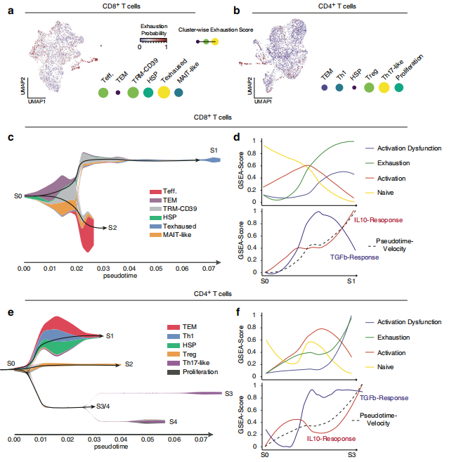 該團(tuán)隊(duì)對(duì)?8?名診斷為新發(fā)膠質(zhì)母細(xì)胞瘤的患者腫瘤組織樣本進(jìn)行了單細(xì)胞測(cè)序和數(shù)據(jù)分析,發(fā)現(xiàn)“S1”狀態(tài)與?T?細(xì)胞耗竭/功能障礙標(biāo)志物(HAVCR2、CTLA4?和?PDCD1)的表達(dá)增加,為了確定與?T?細(xì)胞耗竭相關(guān)的轉(zhuǎn)錄途徑,進(jìn)行了通路信號(hào)傳導(dǎo)推斷,揭?示了?T?細(xì)胞耗竭與?IL-10?以及部分?TGF??反應(yīng)之間存在著相關(guān)性。