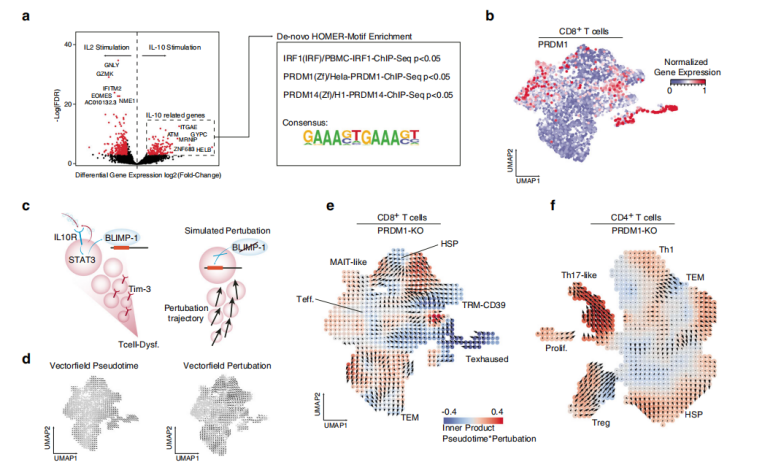 該團(tuán)隊(duì)通過擾動(dòng)模擬,用IL-10刺激所產(chǎn)生scRNA-seq數(shù)據(jù)集富集分析推斷常見轉(zhuǎn)錄因子結(jié)合位點(diǎn),發(fā)現(xiàn)ChiP-seq數(shù)據(jù)中基因BLIMP-1和IRF1峰之間密切重疊,IRF1和PRDM1/14結(jié)合位點(diǎn)的顯著富集,提出了“IL10-STAT3-BLIMP-1信號(hào)軸可能是腫瘤相關(guān)T細(xì)胞耗竭的潛在驅(qū)動(dòng)因素”的假設(shè)。為了進(jìn)一步驗(yàn)證猜想,作者對(duì)PRDM1進(jìn)行了計(jì)算機(jī)擾動(dòng)模擬驗(yàn)證,發(fā)現(xiàn)膠質(zhì)瘤母細(xì)胞瘤微環(huán)境中髓樣細(xì)胞分泌IL-10驅(qū)動(dòng)誘發(fā)T?細(xì)胞耗竭。