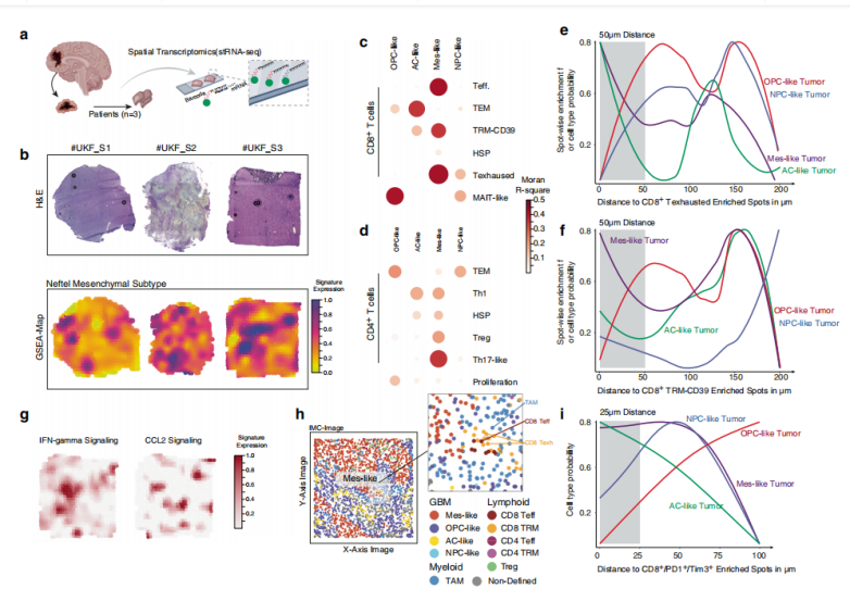 為了確定?T?細(xì)胞簇的空間位置信息,以及與特定腫瘤狀態(tài)共定位信息,作者進(jìn)行了空間分辨轉(zhuǎn)錄組RNA測(cè)序(stRNAseq)。該團(tuán)隊(duì)收集3名原發(fā)性GBM IDH1/2 Wt患者組織樣本,數(shù)據(jù)集總共包含2352個(gè)測(cè)序點(diǎn),每個(gè)點(diǎn)的中位數(shù)為8個(gè)細(xì)胞(范圍:每個(gè)spot點(diǎn)捕獲4~22個(gè)細(xì)胞)。作者通過NMF回歸和Moran統(tǒng)計(jì)分析,發(fā)現(xiàn)CD8+T細(xì)胞簇與GBM亞型相關(guān)聯(lián),腫瘤區(qū)域富集為間充質(zhì)樣腫瘤(MES樣),星形膠質(zhì)細(xì)胞樣(AC樣)轉(zhuǎn)錄特征與活化的CD8+效應(yīng)子、CD8+T耗盡簇共定位。