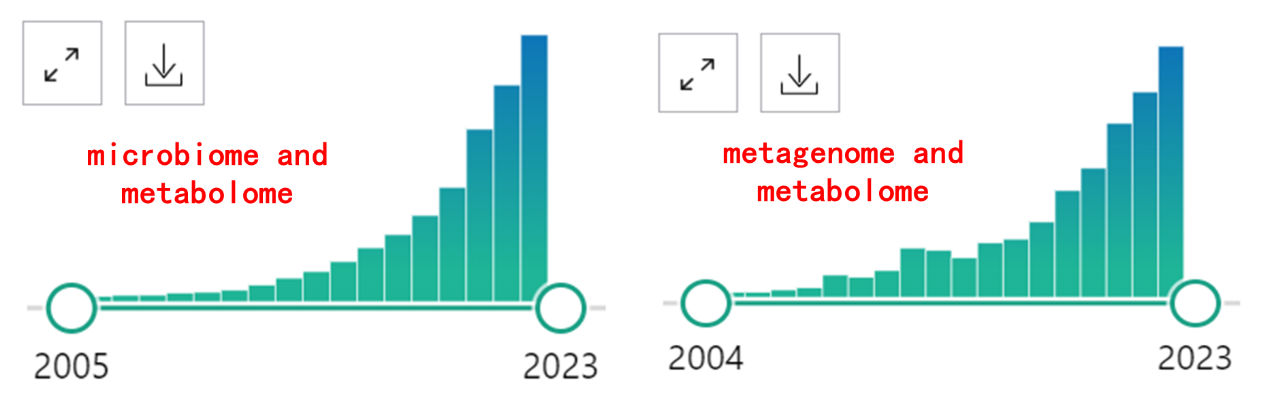 而近年來,關(guān)鍵詞“microbiome and metabolome”、“metagenome and metabolome”也是逐漸備受關(guān)注的熱點話題,PubMed搜索發(fā)文量也是逐年上升的趨勢。
