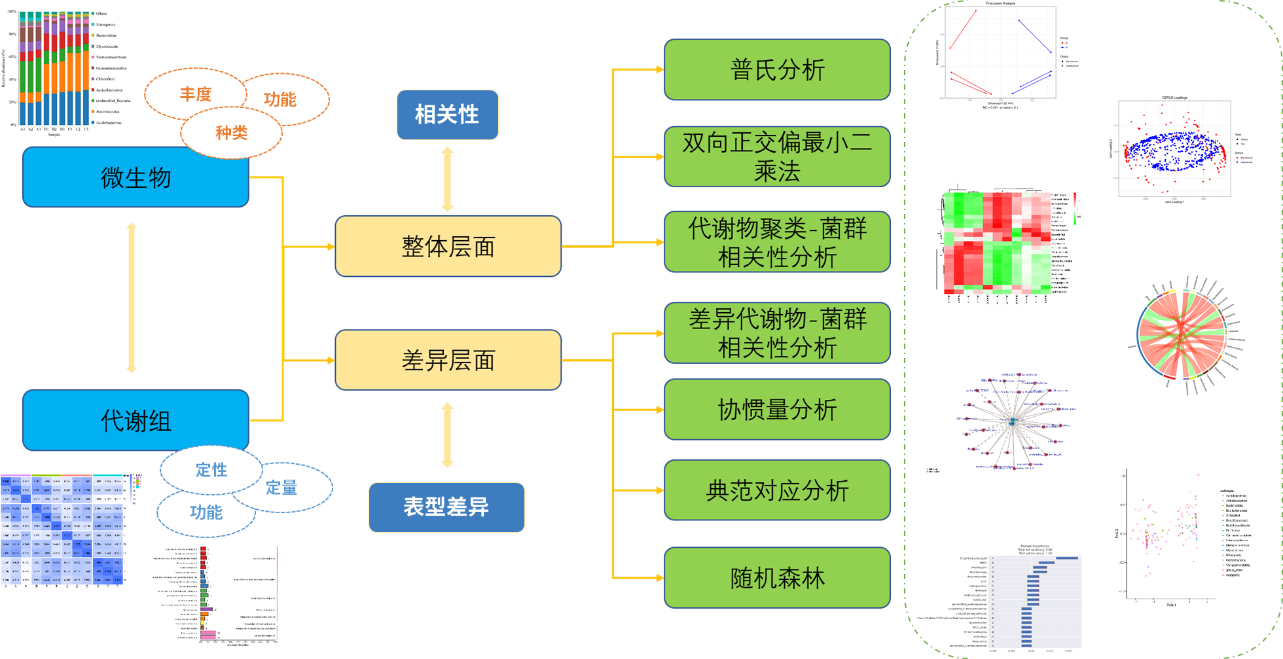 微生物和代謝組聯(lián)合分析從兩個層面去進(jìn)行聯(lián)合,整體層面去展示微生物和代謝物之間的整體相關(guān)性,比如普氏分析、代謝物聚類-菌群相關(guān)性分析;從差異層面則基于不同的差異處理組,去進(jìn)一步聯(lián)系表型關(guān)系,看具體的微生物和代謝之間的關(guān)系是否與生物的表型差異相關(guān),這里則主要有差異代謝物和菌群相關(guān)性分析、協(xié)慣量分析、典范對應(yīng)分析、隨機森林分析等,接下來我們就這些分析和大家具體看下怎么解讀和應(yīng)用。