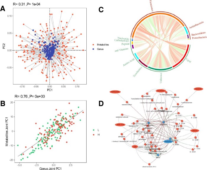 (A) Procrustes analysis (PA):連接兩點的線的長度表示兩個數(shù)據(jù)集之間樣本的一致性。(B) O2PLS模型:O2PLS模型中具有較大的荷載值,被認(rèn)為是它們相似性的重要因素。(C) 微生物和代謝物之間的spearman相關(guān)性的Circos圖。(D) 不同的代謝物和屬于韌皮部的微生物之間的spearman相關(guān)網(wǎng)絡(luò)。