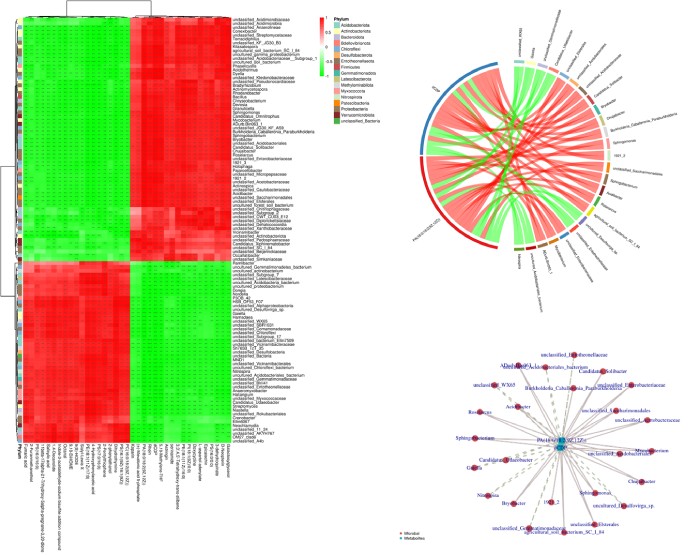 差異代謝物-差異菌群相關(guān)性熱圖(左)、差異代謝物-差異菌群相關(guān)性和弦圖(右上)、差異代謝物-差異菌群相關(guān)性網(wǎng)絡(luò)圖(右下)