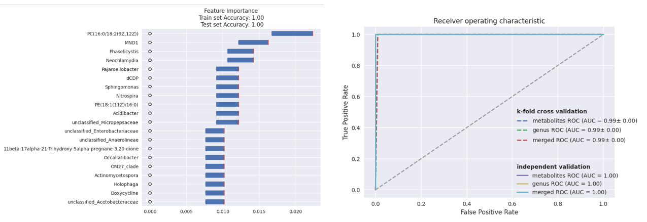 右圖注:虛線顯示訓(xùn)練集K重交叉驗證的平均ROC曲線,實線顯示獨立驗證的ROC曲線。不同顏色虛線和實線分別表示代謝組、微生物組(屬水平)分別建模以及合并建模的ROC曲線。