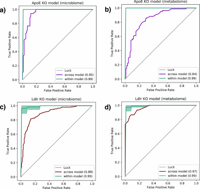 綠色曲線代表每個小鼠模型內(nèi)的分類準(zhǔn)確性。紫色ROC曲線對應(yīng)于使用來自ApoE-/-小鼠模型的腸道微生物組(a)和代謝組(b)數(shù)據(jù)訓(xùn)練的模型,以預(yù)測Ldlr-/-小鼠的IHH暴露。紅色曲線顯示的是在ApoE-/-小鼠上測試的Ldlr-/-小鼠的微生物組(c)和代謝組(d)數(shù)據(jù)。IHH:間歇性低氧和高碳酸血癥。