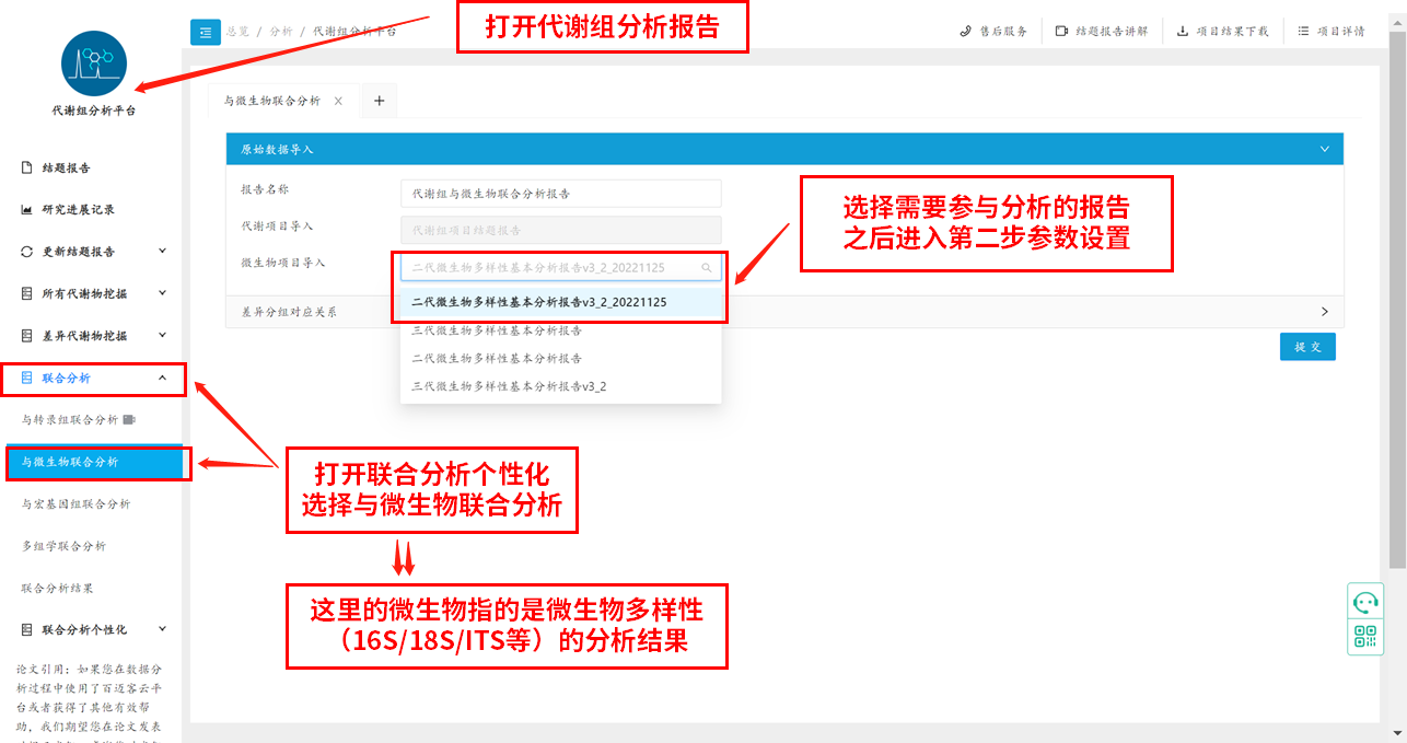 首先,我們進(jìn)入百邁客云平臺,打開代謝組分析結(jié)題報告,在報告左側(cè)找到聯(lián)合分析模塊,然后選擇與微生物聯(lián)合分析個性化,再在右側(cè)選擇需要參與分析的微生物報告,之后進(jìn)入第二步參數(shù)設(shè)置,示例圖如下: