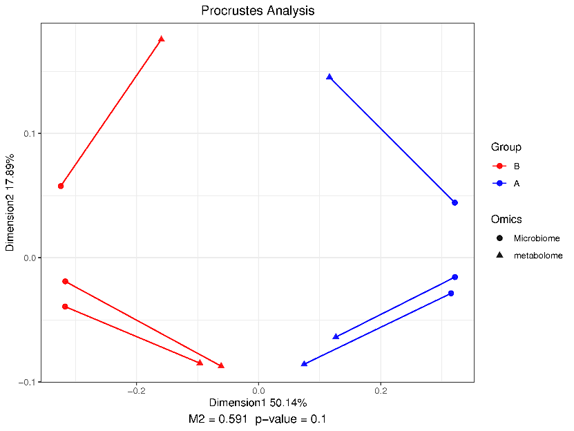 由于兩組數(shù)據(jù)集的屬性不同,并不適合用來直接比較,可分別對兩個數(shù)據(jù)集降維排序分析,并提取特征軸的坐標(biāo)。本分析選用 PCoA 分別對微生物組(屬水平)和代謝組進(jìn)行降維排序,之后進(jìn)行Procrustes分析,比較微生物組與代謝組之間的相似和變異情況。