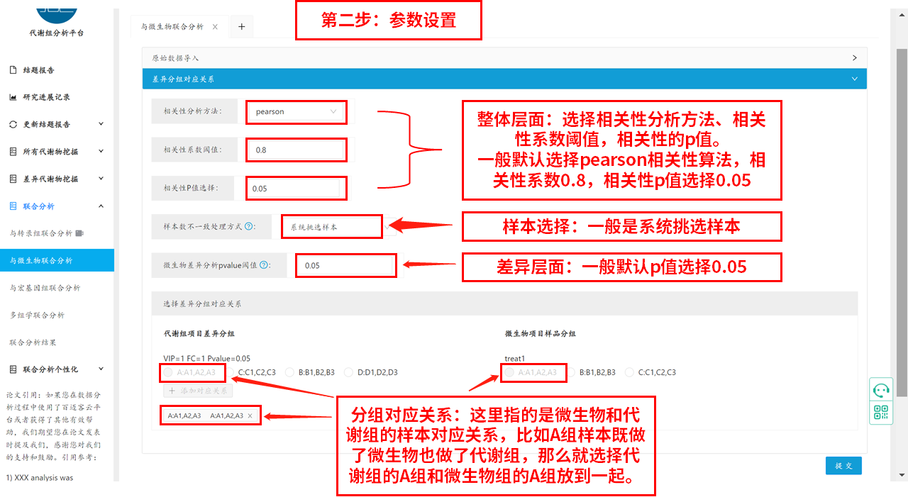 第二步參數(shù)設(shè)置:整體層面選擇相關(guān)性分析方法、相關(guān)性系數(shù)閾值,相關(guān)性的p值。一般默認(rèn)選擇pearson相關(guān)性算法,相關(guān)性系數(shù)0.8,相關(guān)性p值選擇0.05。分組對應(yīng)關(guān)系:這里指的是微生物和代謝組的樣本對應(yīng)關(guān)系,比如A組樣本既做了微生物也做了代謝組,那么就選擇代謝組的A組和微生物組的A組放到一起,具體示例圖如下: