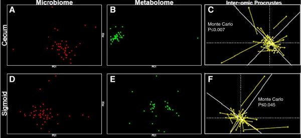 圖注:Procrustes分析:第一列圖表包含微生物組數(shù)據(jù)(紅點),第二列包含代謝組數(shù)據(jù)(綠點)。第一行包含盲腸數(shù)據(jù),第二行包含乙狀結(jié)腸數(shù)據(jù)。對盲腸微生物組(A)、盲腸代謝組(B)、乙狀結(jié)腸微生物組(D)和乙狀結(jié)腸代謝組(E)進(jìn)行主成分分析。然后進(jìn)行樣本點間(C和F) Procrustes分析。Procrustes圖上的線越長,表明微生物組和代謝組的對象內(nèi)差異越大。所示的顯著性值是使用Vegan R軟件包中的protest函數(shù)計算的,該函數(shù)進(jìn)行重復(fù)的對稱Procrustes分析以估計顯著性。