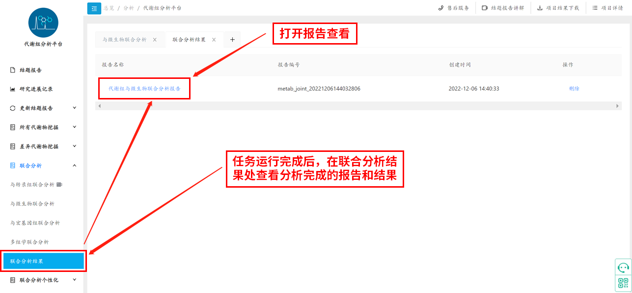 提交分析:等待分析完成獲得分析報告結(jié)果,一般任務(wù)運行周期1-2h。任務(wù)運行完成后,在聯(lián)合分析結(jié)果處查看分析完成的報告和結(jié)果,示例圖如下: