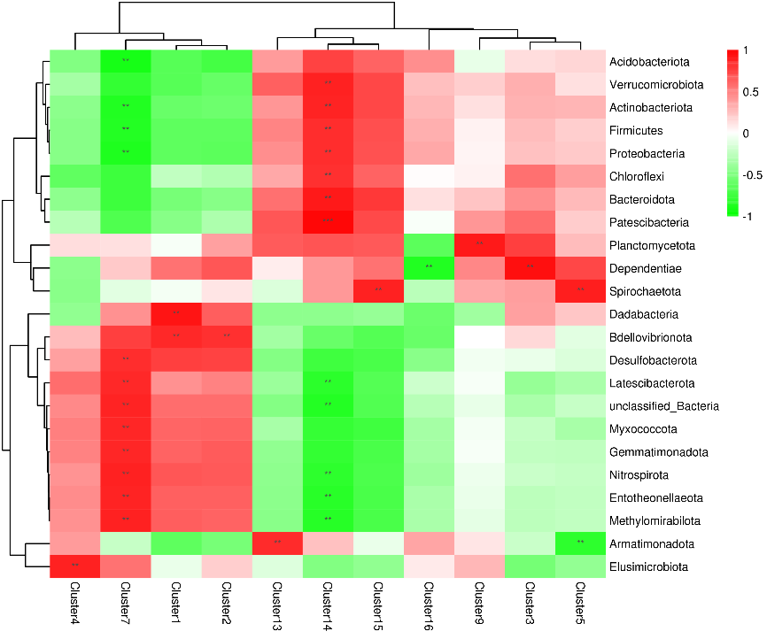 注:圖右側(cè)為微生物(門水平),下方為代謝物簇,左側(cè)和上方分別為微生物和代謝物簇的聚類樹狀圖。不同顏色代表皮爾遜相關(guān)系數(shù)的大小,絕對值越接近于 1,相關(guān)性越高。紅色表示正相關(guān),而綠色表示負(fù)相關(guān)。星號表示代謝物簇和微生物之間顯著性相關(guān)(p<0.05),*、**和***表示相關(guān)性顯著程度依次增強,分別表示 p<0.05,p<0.01和 p<0.001.