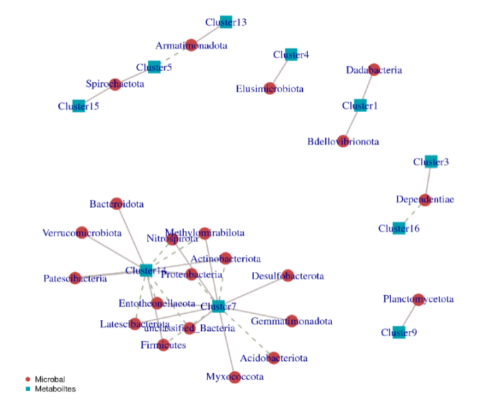 注: 圖中代謝物簇用藍(lán)色方形標(biāo)出,微生物用紅色圓形標(biāo)出。實線代表正相關(guān),虛線代表負(fù)相關(guān)。