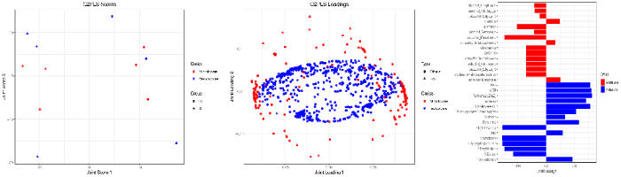 右圖注:圖中展示了載荷值長度 top10 的代謝物和載荷值長度 top15 的微生物,紅色柱子代表微生物,藍(lán)色柱子代表代謝物。橫坐標(biāo)表示聯(lián)合載荷軸 1,縱坐標(biāo)表示代謝物/微生物。