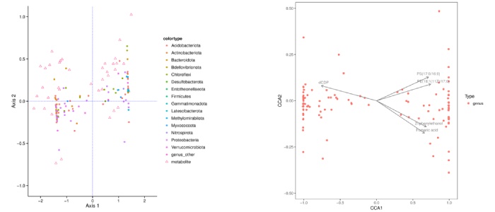 右圖注:圖中的點表示微生物,箭頭為代謝物(為了更清晰的展示代謝物,根據(jù)圖幅,統(tǒng)一將箭頭的長度進(jìn)行了一定比例的縮放),僅展示箭頭長度top5 的代謝物名稱。微生物和原點連線與箭頭形成的夾角反映了代謝物和微生物之間的相關(guān)性,銳角為正相關(guān),鈍角為負(fù)相關(guān),直角為不相關(guān)。