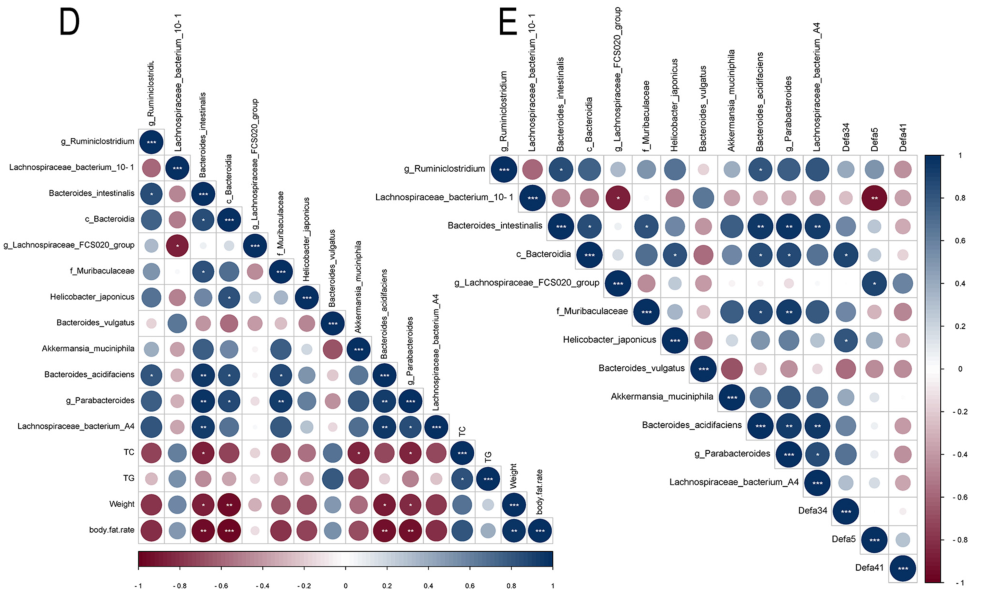 EA促進了腸粘膜免疫中3個代表性基因Defa5、Defa20和Defa41的表達,其中Defa5顯著上調(diào)(圖6A);EA還恢復(fù)了這些防御素的蛋白質(zhì)水平,其中Defa5和Defa41顯著增加(圖6B)。斯皮爾曼相關(guān)系數(shù)分析結(jié)果顯示,Defa5和Defa34的蛋白質(zhì)水平與關(guān)鍵肥胖指數(shù)呈負相關(guān),包括體重、體脂百分比以及甘油三酯TG、總膽固醇TC含量(圖6C);,EA下調(diào) Lachnospiraceae bacterium_10_1和 Bacteroides acidifaciens物種的相對豐度,與肥胖小鼠的關(guān)鍵肥胖指數(shù)呈正相關(guān)(圖6D);EA調(diào)節(jié)的腸道防御素表達與幾種腸道菌群相關(guān)(圖6E)。以上結(jié)果表明,腸道防御素的調(diào)節(jié)是EA拯救肥胖小鼠腸道微生物群的關(guān)鍵機制之一。