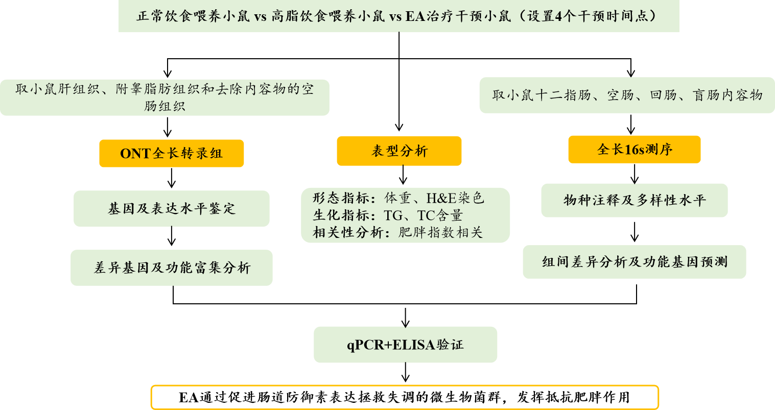 肥胖作為一種不斷增長的非傳染性流行病,影響了超過20億人。腸道微生物菌群失調(diào)已被證明是肥胖和肥胖相關(guān)疾病發(fā)生和進展的關(guān)鍵因素,包括高血壓、II型糖尿病、血脂異常和非酒精性脂肪性肝?。∟AFLD)。針灸已被廣泛用于治療肥胖癥,研究報道,電針(EA)可以減輕肥胖小鼠的體重,挽救生態(tài)失調(diào)的腸道微生物群,還可以調(diào)節(jié)免疫力。然而,EAEA重塑腸道微生物群的潛在機制尚不清楚,如何通過腸道微生物菌群調(diào)節(jié)腸道先天免疫力對抗肥胖仍有待闡明。