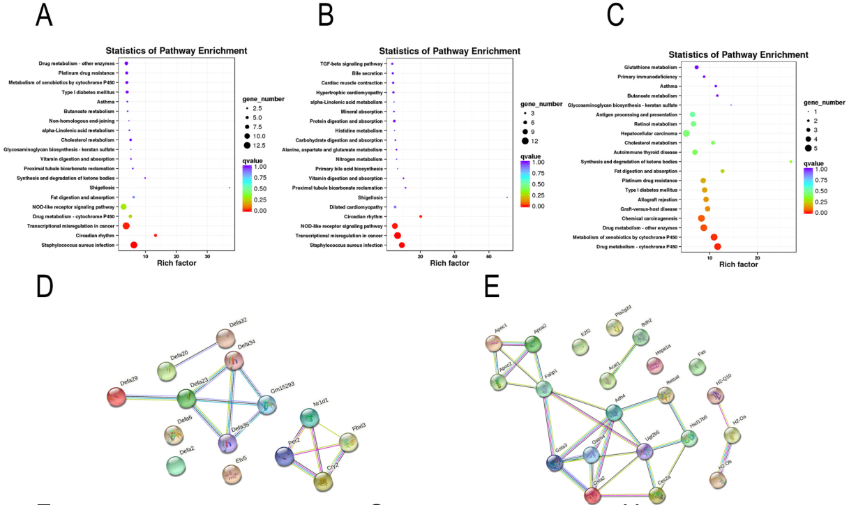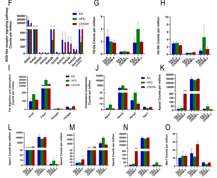 對共有DEG進行功能富集分析,發(fā)現(xiàn)顯著富集的通路主要與宿主先天防御和脂質(zhì)代謝相關(guān)(圖3A);在去除功能未鑒定的基因或lncRNA后,獲得140個上調(diào)和92個下調(diào)的DEG也進行功能富集分析(圖3B, 3C);然后,對top20通路的DEG進行PPI調(diào)控網(wǎng)絡(luò)分析(圖3 D, 3E),結(jié)果顯示,EA主要上調(diào)的通路包括α防御素基因在內(nèi)的NOD樣受體信號通路(圖3 D),下調(diào)的通路脂質(zhì)代謝(包括脂質(zhì)消化和吸收途徑),以及免疫應(yīng)答相關(guān)通路(谷胱甘肽s-轉(zhuǎn)移酶和MHC II類相關(guān)基因)(圖3E)。基因表達直方圖顯示EA干預(yù)恢復(fù)大量異常表達的DEG,與腸粘膜免疫相關(guān)的DEG,如α防御素基因,可以通過EA顯著恢復(fù)(圖3F);與免疫反應(yīng)相關(guān)的H2-Ob和H2-OA僅在空腸區(qū)域下調(diào)(圖3G, 3H);EA干預(yù)恢復(fù)了fabp1、pla2g2d和acat1的表達水平,主要負責脂肪消化和吸收(圖3I);最后,EA干預(yù)通過下調(diào)apoc1、apoa2和apoc2以及上調(diào)npc1來調(diào)節(jié)膽固醇代謝(圖3J-O)。