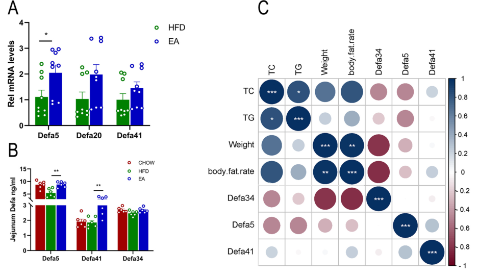 3.EA干預(yù)21天后,健康對照組的防御素α5(Defa5)表達恢復(fù),而肥胖小鼠空腸中包括fabp1在內(nèi)的脂肪消化吸收基因表達顯著降低;