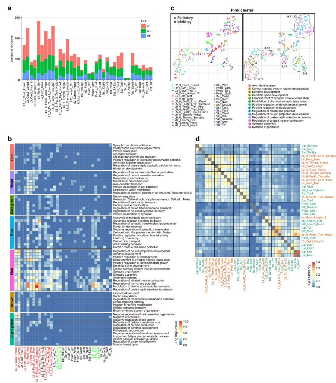 作者計算了每種已鑒定亞型GO中DE基因的富集程度,一些神經(jīng)元亞型在癲癇中表現(xiàn)出了大的轉(zhuǎn)錄組改變(>100豐富的GO),但多數(shù)神經(jīng)元亞型中只有少數(shù)GO,特別是對于生物過程(BP)來說,這應(yīng)該與通路的生物學(xué)功能相關(guān)(圖2a)。這些受影響較小的亞型中,大多數(shù)在癲癇細胞和非癲癇細胞之間也具有高的基因表達相關(guān)性(圖1d),從而證實癲癇和非癲癇之間轉(zhuǎn)錄組相關(guān)性高的亞型中,癲癇改變的信號通路也較少。