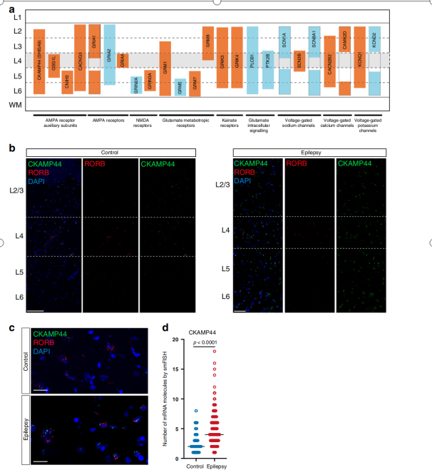 癲癇患者皮層谷氨酸介導(dǎo)興奮相關(guān)基因顯著分層上調(diào)或下調(diào)。作者用單分子熒光原位雜交(smFISH)方法標(biāo)記了幾個高度調(diào)控基因的mRNA。如上所述,在主要神經(jīng)元的亞型中,編碼AMPA輔助亞基的許多基因分層上調(diào)。因此,在一組癲癇和非癲癇樣本的皮質(zhì)切片中標(biāo)記了CKAMP44 mRNA,通過與Rorb和DAPI共標(biāo)記,并確定了L2/3、L4和L5/6的位置(圖4b)。重要的是,證實了各層中CKAMP44的表達顯著上調(diào)(圖4b)。