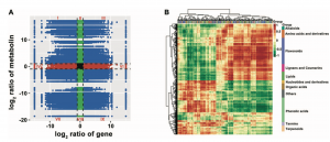 最后,為了進一步準確了解成熟果實中轉(zhuǎn)錄水平與代謝物變化之間的關(guān)系,作者進行了DEGs與DAMs之間的相關(guān)分析,其中,變化趨勢相同的DEGs和DAMs主要涉及類黃酮、酚酸類、氨基酸及其衍生物、萜類、有機酸、脂類等(圖7)。