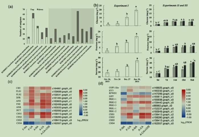圖6(a)試驗I(白色背景)、II(淺灰色背景)和III(深灰色背景)中普遍富集的碳水化合物代謝通路(KEGG通路,p<0.05),(b)試驗I、II和III在低溫馴化期間葉片中葡萄糖、果糖和蔗糖濃度的變化,(c)KO00941類黃酮生物合成通路的DEGs熱圖,(d)KO04712植物晝夜節(jié)律通路的DEGs熱圖