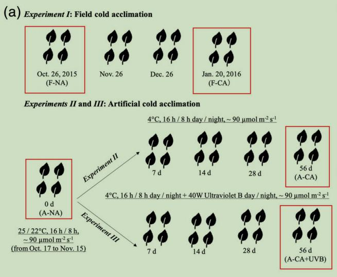 選3年生的“ElsieLee”杜鵑,用于田間或人工低溫馴化試驗,共3組試驗:ExperimentI田間低溫馴化(F-CA),ExperimentII人工低溫馴化(A-CA),ExperimentIII人工用紫外光B進行低溫馴化(A-CA+UVB)。每組試驗36盆,分為3個生物學重復,每個生物學重復12盆,采集當年生長的完全展開的葉子進行實驗,葉片在抽樣日期收集后立即在液氮中冷凍,然后-80℃保存。