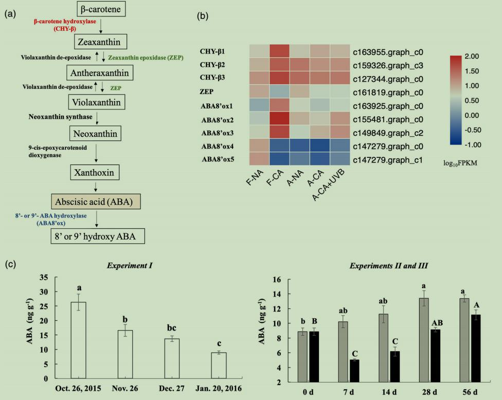 圖3(a)β-胡蘿卜素介導的脫落酸代謝途徑,(b)β-胡蘿卜素介導的脫落酸代謝途徑的DEGs熱圖,(c)田間(試驗I)和人工(試驗II和III)低溫馴化過程中葉片組織ABA含量的變化。