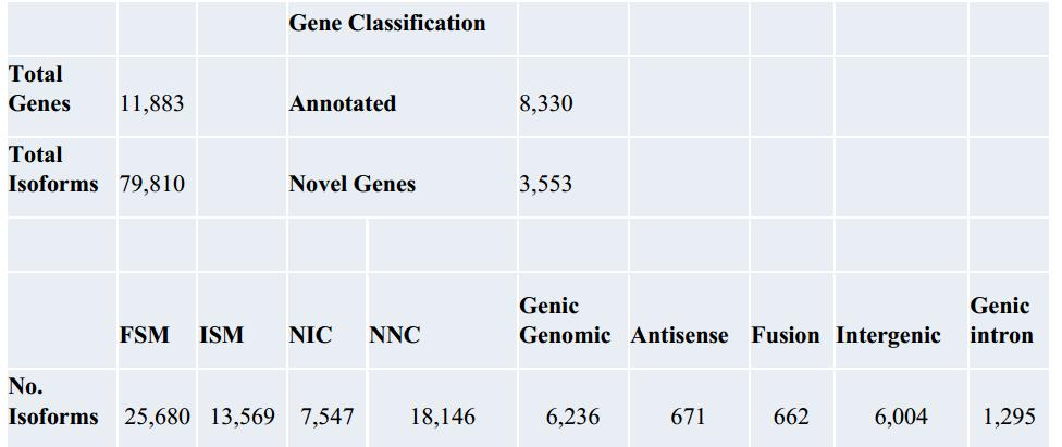 作者獲得了3100萬次reads,其中使用Canu對2200萬reads(71%)進行了錯誤糾正,只關(guān)注全長reads,通過確定為具有5’引物和poly(A)和3’引物的序列全長序列。ToFU轉(zhuǎn)錄組結(jié)果包含總共11,883個基因和79,810個亞型(表北京百邁客生物科技有限公司1),其中8330個基因與NCBI注釋基因匹配,而3553個基因是新的。所有這些都對應(yīng)于橄欖蠅轉(zhuǎn)錄組在同種型水平上比當前NCBI注釋的四倍擴增。針對UniprotSwiss-prot數(shù)據(jù)庫的預(yù)測蛋白質(zhì)序列的搜索顯示高比對的是雙翅目,其次是哺乳類動物(圖1B)。盡管鑒定了3553個新基因,但預(yù)計只有269個含有開放閱讀框。與注釋基因相比,超過50%的新基因是單外顯子,其中超過80%的基因是多外顯子并且還包含更高百分比的單同種型基因。且新基因的表達量要低于已注釋基因。在結(jié)構(gòu)上,SQANTI根據(jù)其剪接點和基因組坐標將轉(zhuǎn)錄本分為9類,分別為FSM,ISM,NIC,NNC,基因組基因,反義,融合,基因間區(qū)和基因內(nèi)含子(圖1E)。
