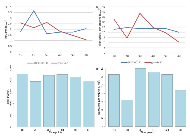 為了獲得轉(zhuǎn)錄數(shù),在cDNA合成步驟中以每個時間點使用的每個胚胎數(shù)的恒定比率添加ERCC內(nèi)部加標RNA標準。在測序和比對后,通過2個步驟實現(xiàn)標準化,使用Mandalorion對測序深度進行相對標準化,得到每10000個映射讀數(shù)的每個基因讀數(shù)的轉(zhuǎn)錄本豐度(RP10K),我們注意到我們的RNA標準品的相對標準化豐度隨時間變化,這很可能是由于胚胎中poly(A)RNA含量的變化(圖2A)。在第二步中,我們使用ERCC標準生成的標準曲線將我們的相對計數(shù)轉(zhuǎn)換為每個胚胎的計數(shù)。在這里,我們注意到ERCC標準并沒有隨著時間點的不同而發(fā)生顯著的變化(圖2B)。有趣的是,與相對表達相反,當所有基因的每個胚胎的轉(zhuǎn)錄物的數(shù)量相加并在時間點上繪圖時(圖2C和D),該譜與每個胚胎產(chǎn)生的cDNA相似(補充圖4A),因此驗證標準化方法。相鄰時間點北京百邁客生物科技有限公司顯示出比遠距離時間點更高的基因表達相關(guān)性,其中連續(xù)樣本的Spearman相關(guān)性始終等于或高于0.96。