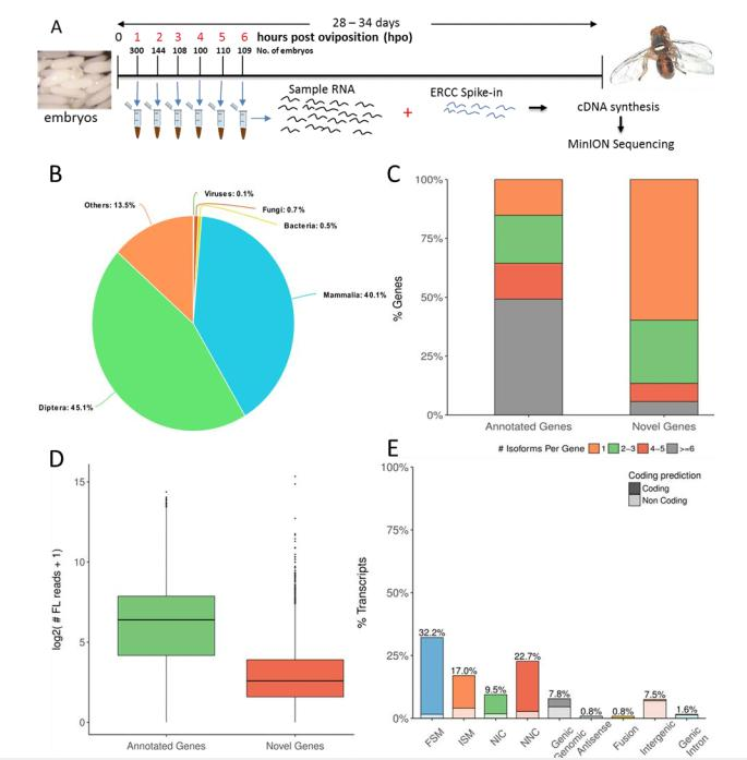 由于受精卵的興趣和令人費解的性質(zhì),胚胎發(fā)育已在模型生物中廣泛研究。然而,在生物中沒有很好表征,長讀長RNA-seq有可能揭示迄今未知的基因,完善注釋信息,并擴展亞型多樣性。作者匯集了混合性別橄欖果蠅(Bactroceraoleae)胚胎,這些胚胎在產(chǎn)卵的前6個小時后每小時收集一次。這些時期的研究很有意義,因為之前對B.oleae的研究表明,在此期間開始通過基因的可變剪接介導(dǎo)的性別決定機制。此外,來自地中海實蠅(Ceratitiscapitata)的證據(jù)表明,在此期間發(fā)生極細胞(原始生殖細胞)的建立,因此,在此期間闡明轉(zhuǎn)錄狀態(tài)非常重要。