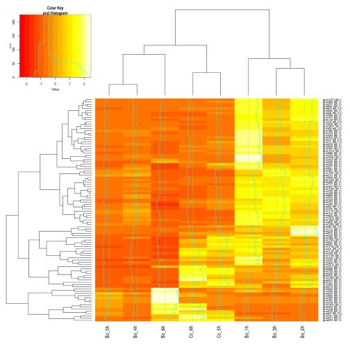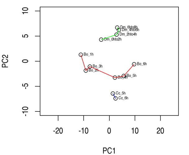 進一步尋求確定觀察到的表達模式是否可以在不同的生物樣品組中重復(fù)并使用實時定量PCR(qPCR),這是當前用于量化基因表達的標準方法。然而,qPCR基因表達的相對方法需要鑒定內(nèi)參基因其表達在樣品間保持穩(wěn)定。使用作者的數(shù)據(jù)來確定這些常見內(nèi)參基因以及GAPDH的表達水平的變化,評估了3個基因的qPCR表達;SRY,HID和LINGERER,用RPL19和14-3-3zeta作為內(nèi)參基因,在不同的生物重復(fù)樣品組中(跳過6小時時間點)。我們觀察到類似的基因表達趨勢(特別是14-3-3zeta與RPL19相比)。為了進一步探索表達譜,我使用差異表達的明顯的基因進行主成分分析(PCA)和層次聚類分析,第一個主成分將前3個時間點與最后3個時間點分開,分層聚類進一步表明前3個和后3個時間點是分別共同聚類的。