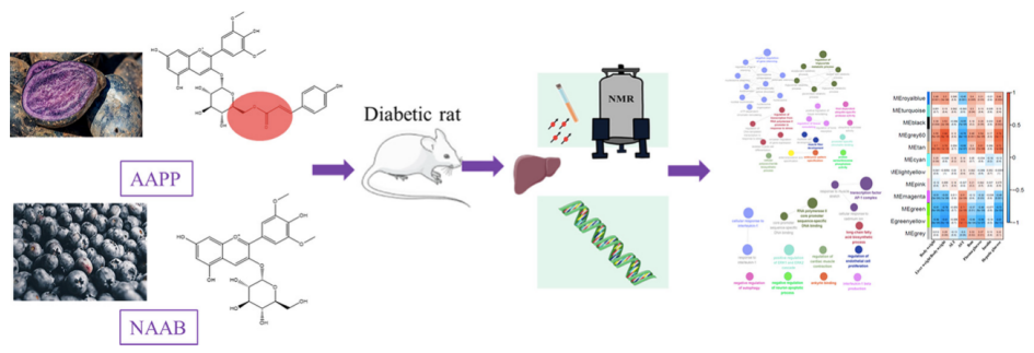 花色苷是植物中的一大類多酚化合物,目前已知是對(duì)氧化應(yīng)激、炎癥和能量穩(wěn)態(tài)有調(diào)節(jié)作用。已有報(bào)道發(fā)現(xiàn)花色苷具有抗糖尿病的療效。花色苷的核心結(jié)構(gòu)是花青苷,它可以糖基化形成非酰化的花青苷,糖苷可以?;笮纬甚;幕ㄇ嘬?。且最近有研究表明,與未?;幕ㄇ嘬障啾?,?;ㄇ嘬站哂懈玫姆€(wěn)定性和抗氧化活性。本研究利用全長轉(zhuǎn)錄組學(xué)和核磁共振代謝組學(xué)方法,比較了非酰化和?;ㄉ諏?duì)糖尿病大鼠肝臟基因表達(dá)和代謝的影響。這是第一次綜合應(yīng)用這兩種強(qiáng)大的技術(shù)來研究肝臟基因表達(dá)和代謝產(chǎn)物的變化。