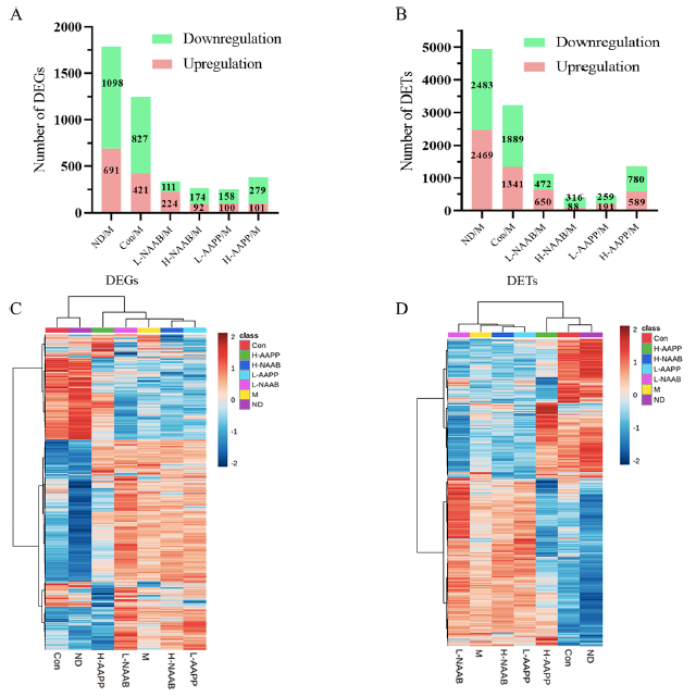 圖1 DEGs(AC)及DETs(BD)的統(tǒng)計(jì)分析
