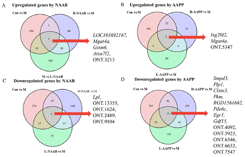 韋恩圖表明了不同分組之間上調(diào)和下調(diào)的DEG的交集,揭示了受NAAB和AAPP影響的特定基因(圖2A?D)。Gstm6與谷胱甘肽代謝、藥物代謝以及細(xì)胞色素P450對(duì)外源物質(zhì)的代謝有關(guān),在胰島素抵抗和糖尿病小鼠中均被報(bào)道下調(diào),并可能參與T2D的進(jìn)展。L-NAAB和H-NAAB均能恢復(fù)Gstm6的表達(dá)。與ND組和Con組相比,M組中有一個(gè)共同的基因被兩種花色苷提取物(NAAB和AAPP)上調(diào),即編碼N-乙酰氨基葡萄糖轉(zhuǎn)移酶GnT-4a的Mgat4a。在小鼠中,Mgat4a基因的遺傳失活導(dǎo)致葡萄糖轉(zhuǎn)運(yùn)蛋白2N-聚糖的錯(cuò)誤組裝,導(dǎo)致葡萄糖轉(zhuǎn)運(yùn)蛋白2和質(zhì)膜凝集素Galectin 9之間的相互作用失敗,導(dǎo)致葡萄糖轉(zhuǎn)運(yùn)蛋白2內(nèi)化,從而抑制葡萄糖攝取和葡萄糖刺激的胰島素分泌。還發(fā)現(xiàn)高脂飲食抑制了Mgat4a的表達(dá)。藍(lán)莓的非酰化花色苷和紫色馬鈴薯的?;ㄇ嘬斩际侨绱?。編碼脂蛋白脂肪酶的LPL在小鼠肝臟中過表達(dá),導(dǎo)致肝臟甘油三酯含量增加2倍,并導(dǎo)致胰島素抵抗,部分原因是對(duì)胰島素的反應(yīng)受損,抑制內(nèi)源性葡萄糖的產(chǎn)生。在本研究中,L-NAAB和H-NAAB都下調(diào)了ZDF大鼠高水平的LPL,這可能導(dǎo)致胰島素敏感性的改善。早期生長反應(yīng)基因-1(Egr1)可被胰高血糖素短暫激活,介導(dǎo)胰高血糖素調(diào)節(jié)的糖異生。AAPP降低Egr1,這可能與糖異生減少有關(guān)。