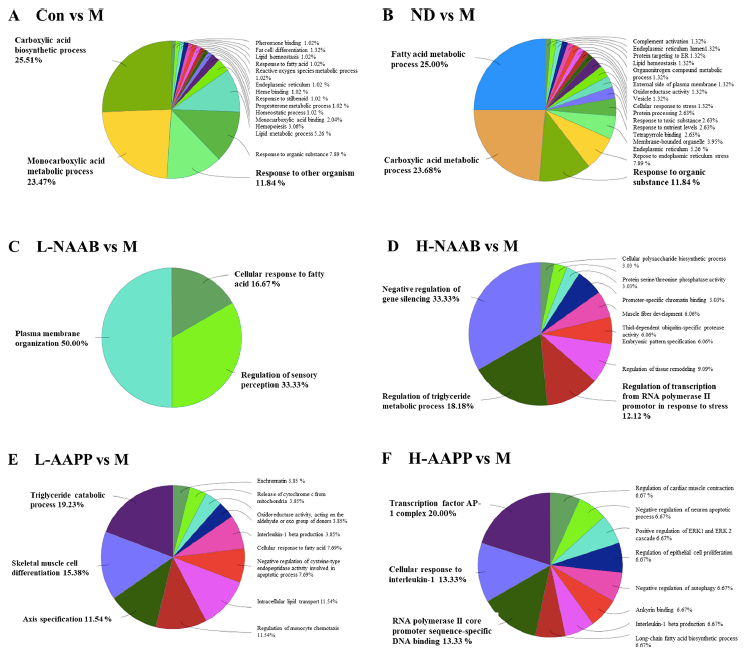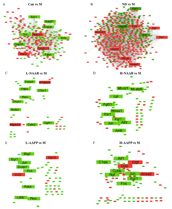 對(duì)不同分組中的DEGs進(jìn)行ClueGO分析,以生成按功能分組的注釋網(wǎng)絡(luò)圖(圖4A?F)。在CON/M差異分組的結(jié)果中,DEGs主要富集在羧酸生物合成過程、單羧酸代謝過程和對(duì)其他有機(jī)物的反應(yīng)過程。在ND/M分組差異結(jié)果中,脂肪酸代謝過程、羧酸代謝過程和對(duì)有機(jī)物的反應(yīng)過程是富集排名前3的功能分組。在ND/M和CON/M分組中,DEGs主要在單羧酸代謝過程、羧酸生物合成過程、脂肪酸代謝過程、脂肪代謝過程和對(duì)有機(jī)物的反應(yīng)過程相關(guān)的通路中富集。在L-NAAB/M分組差異結(jié)果中,DEGs組要與三個(gè)功能通過有關(guān):質(zhì)膜組織、感覺調(diào)節(jié)和細(xì)胞對(duì)脂肪酸的反應(yīng)。在H-NAAB/M差異結(jié)果中,DEGs主要富集于基因沉默的負(fù)調(diào)控、甘油三酯代謝過程的調(diào)控以及RNA聚合酶II啟動(dòng)子對(duì)脅迫反應(yīng)的轉(zhuǎn)錄調(diào)控。在L-AAPP/M比較中,DEGs在甘油三酯分解代謝過程、骨骼肌細(xì)胞分化和軸規(guī)范方面都明顯富集。在H-AAPP/M差異結(jié)果中,發(fā)現(xiàn)轉(zhuǎn)錄因子AP-1復(fù)合體、細(xì)胞對(duì)白細(xì)胞介素-1的反應(yīng)以及RNA聚合酶II核心啟動(dòng)子序列特異性DNA結(jié)合等通路顯著富集。