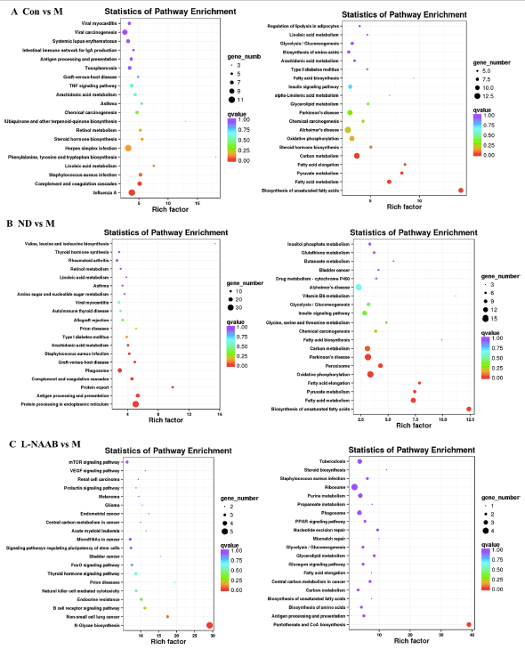 接下來,進(jìn)行了KEGG通路富集分析。氣泡圖展示富集最顯著的前20條通路(圖5A?F)。與M組相比,Con組上調(diào)的DEGs主要富集于以下通路:苯丙氨酸、酪氨酸和色氨酸的生物合成,亞油酸代謝,金黃色葡萄球菌感染,補(bǔ)體和凝血級(jí)聯(lián)反應(yīng),以及甲型流感病毒。ND組與M組相比,上調(diào)的DEGs主要富集在花生四烯酸代謝、金黃色葡萄球菌感染、移植物抗宿主病、吞噬小體等通路中,而ND組與M組相比上調(diào)的DEGs主要富集在以下通路:苯丙氨酸、酪氨酸和色氨酸的生物合成、亞油酸代謝、金黃色葡萄球菌感染、移植物抗宿主病、吞噬小體。在CON/M和ND/M比較中,下調(diào)的DEGs在相似的KEGG通路中富集:不飽和脂肪酸的生物合成、脂肪酸代謝、丙酮酸代謝、脂肪酸伸長、氧化磷酸化和碳代謝。對(duì)于花色苷處理組,L-NAAB組上調(diào)的DEGs在N-糖鏈生物合成通路中顯著富集。L-NAAB組下調(diào)的DEGs在泛酸和CoA生物合成通路中顯著富集。在H-NAAB、L-AAPP和H-AAPP組中沒有發(fā)現(xiàn)下調(diào)的DEGs有顯著富集的通路,在H-NAAB和L-AAPP組中上調(diào)的DEGs也沒有富集的通路。H-AAPP中上調(diào)的DEGs在補(bǔ)體和凝血級(jí)聯(lián)、不飽和脂肪酸和變形蟲病的生物合成等通路中顯著富集。
