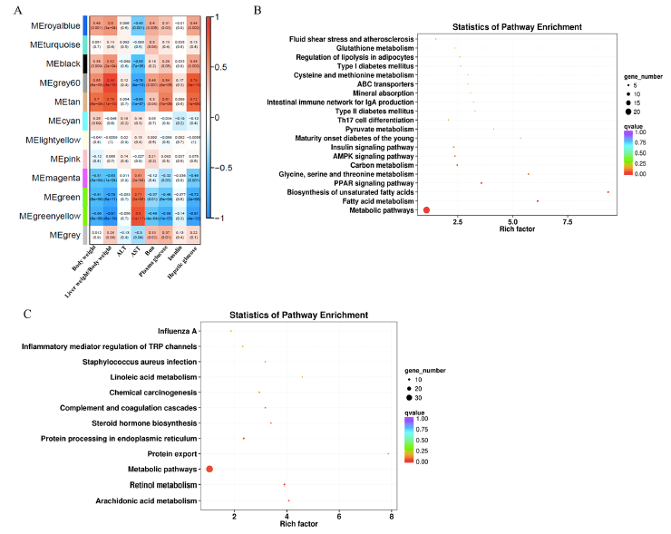 使用DEGs進(jìn)行WGCNA分析以確定共表達(dá)模塊及其與臨床特征的相關(guān)性。確定了12個(gè)共表達(dá)模塊,并與以前報(bào)道的各種臨床特征(體重、AST、ALT、血尿素氮、血糖和胰島素)相關(guān)(圖7A)。MEgery 60和MEtan模塊與體重、肝重/體重比、血糖、肝糖呈正相關(guān),與天冬氨酸轉(zhuǎn)氨酶呈負(fù)相關(guān)。MEgreen和MEgreenyellow模塊與體重、肝重/體重比、血糖、肝糖呈負(fù)相關(guān),與AST值呈正相關(guān)。接下來,對(duì)MEgrey60和MEtan模塊以及MEgreen和MEgreenyellow模塊中的基因進(jìn)行了KEGG通路富集分析。結(jié)果發(fā)現(xiàn)MEgrey60和MEtan中的基因富集的通路主要涉及脂類代謝(脂肪酸代謝、不飽和脂肪酸的生物合成、脂肪細(xì)胞脂解的調(diào)節(jié))、氨基酸代謝(甘氨酸、絲氨酸和蘇氨酸代謝、半胱氨酸和蛋氨酸代謝、谷胱甘肽代謝)、糖尿病(青少年成熟期糖尿病、II型糖尿病、I型糖尿病、胰島素信號(hào)通路)(圖7B)。MEgreen和MEgreenyellow模塊中的基因主要富集在花生四烯酸代謝、視黃醇代謝、代謝途徑、蛋白質(zhì)輸出、內(nèi)質(zhì)網(wǎng)蛋白質(zhì)加工、類固醇激素生物合成、補(bǔ)體和凝血級(jí)聯(lián)、亞油酸代謝以及TRP通道的炎癥介質(zhì)調(diào)節(jié)(圖7C)。