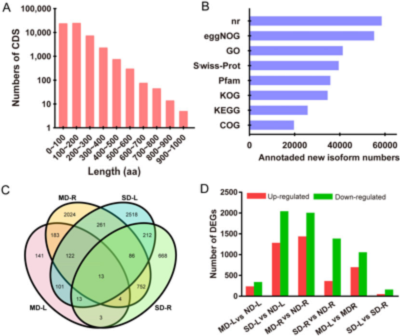 為了闡明干旱響應的分子機制,對不同處理植株的葉(L)和根(R)進行了轉(zhuǎn)錄組測序。6個樣本(每個樣本3個生物重復)共18個cDNA文庫,包括ND-L、MD-L、SD-L、ND-R、MD-R和SD-R。從最初的116,192,367 raw reads中,提取了115,374,531 (99.29%) clean reads,組成玫瑰全長非嵌合轉(zhuǎn)錄組。通過與Rosa chinensis 基因組比對,在轉(zhuǎn)錄組中鑒定出了48,549個基因,占基因組長度的21.46%。此外,共鑒定出59,404個開放閱讀框(ORF),如圖2A所示,只有19個編碼序列(CDSs)編碼>800個氨基酸的多肽,而58%的CDSs編碼長度在100 – 400個氨基酸的小肽(圖2A)。最后,89,044個非冗余轉(zhuǎn)錄本中的58,753個可以被注釋到不同的數(shù)據(jù)庫中(圖2B)。