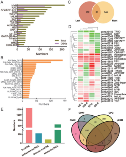 干旱脅迫顯著改變了玫瑰葉片和根中與DEGs相關(guān)的279個轉(zhuǎn)錄因子的表達。MD和SD條件下,MYB、bHLH、b-ZIP、NF-Y、WRKY和AP2家族的TFs顯著富集,其中MYB、AP2和WRKY占主導,差異表達的TFs分別為124、46和27個(圖5A)。bHLH和WRKY家族對干旱脅迫的響應非常相似。在MD-L處理中,有少量的DEGs、上調(diào)基因,但有大量的下調(diào)基因。相比之下,SD-L處理在這些基因家族中導致了更多的上調(diào)基因,并且適應干旱后的葉片和根的干旱響應的倍數(shù)變化通常低于SD處理。如圖5C所示,在干旱脅迫下,葉片和根中分別有133和177個TF基因差異表達(圖5 C),其中31個基因是兩個器官共有的且表達模式相似。例如,gene 6966和49627在MD和SD條件下,在葉片和根中都是表達上調(diào)。一些蛋白激酶家族,包括RLK/Pelle_DLSV(142個成員,玫瑰轉(zhuǎn)錄組中較大的家族)和RLK/Pelle_ RLCK -VIIa -2(101個成員)(圖5 B),在玫瑰轉(zhuǎn)錄組中負責蛋白激酶的大小。