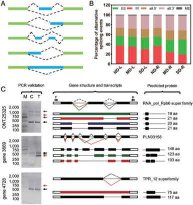 RNA-Seq檢測到的轉(zhuǎn)錄本與R.chinensis ‘Old Blush’基因組進行比對,鑒定剪接異構(gòu)體。如圖7 A所示,我們從非冗余轉(zhuǎn)錄本中檢測到42,544個可變剪接(As),包括12,096個內(nèi)含子保留(IRs)、12,914個選擇性3’剪接位點(alt 3’)、7,433個選擇性5’剪接位點(alt 5’)、9,406個外顯子跳過(ES)和695個互斥外顯子(ME)(圖7 A)。IR在玫瑰葉片中最為常見,在ND-L、MD-L、SD-L和ND-R樣品中的比例分別占34.77%、30.83%、30.1%和29.56%。而在SD脅迫下,ES是主要的AS模式(占所有AS事件的32.16%)。在MD-R中最常見的AS事件是alt 3’ (32.38%), ME(1.75%)是最罕見的(圖7 B)。為了進一步驗證新發(fā)現(xiàn)的轉(zhuǎn)錄組剪接異構(gòu)體,我們隨機選擇了三個至少注釋到兩個異構(gòu)體上的基因(ONT.25325、gene 3669和gene 4728)進行RT- PCR驗證。在這些基因的第一個外顯子和最后一個外顯子或適當區(qū)域設計引物。如圖7 C所示,片段的條帶大小與轉(zhuǎn)錄組數(shù)據(jù)中發(fā)現(xiàn)的剪接亞型的條帶大小一致。對推測的剪接異構(gòu)體進行克隆、測序和比對,以驗證剪接連接。例如,ONT. 25325編碼了一個putative protein,呈現(xiàn)出4個剪接亞型(圖7C),并隨后得到證實。此外,gene 3669和gene 4728顯示出相同的剪接變異。此外,一些剪接異構(gòu)體,如gene 3669,在對照和干旱脅迫下表現(xiàn)出差異。新的可變剪接體的鑒定進一步注釋了R.chinensis ‘Old Blush’基因組。